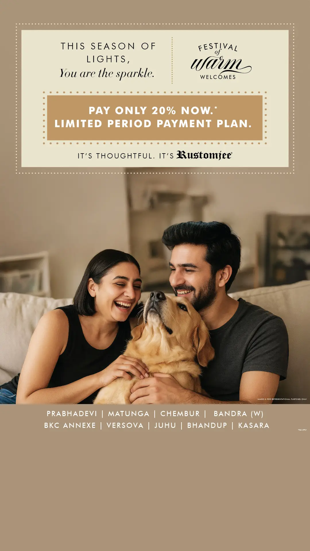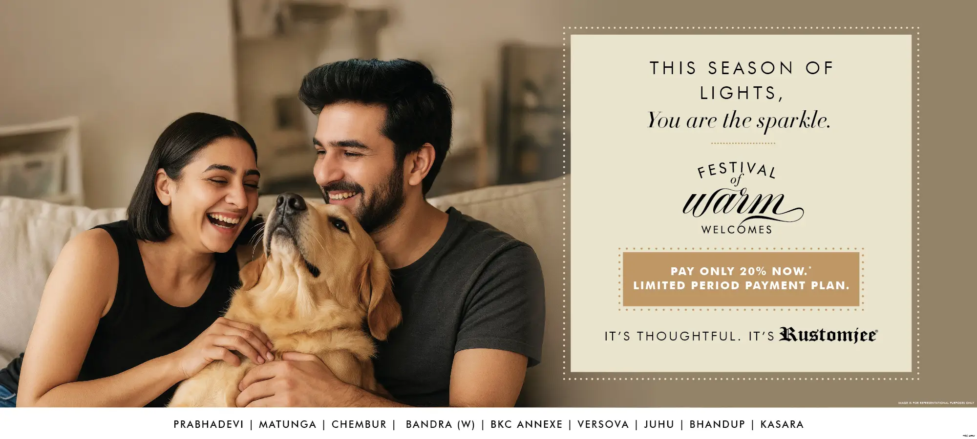 Every Diwali, you open the doors of your heart for everyone. This Diwali, we want to make it easier for you to open the doors of a Rustomjee home with our festive payment plan. Just our way of adding a little more shine to your sparkle. Happy Diwali.